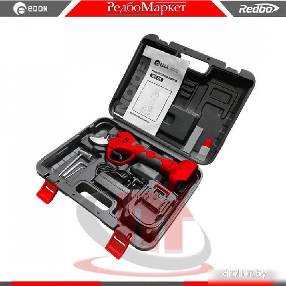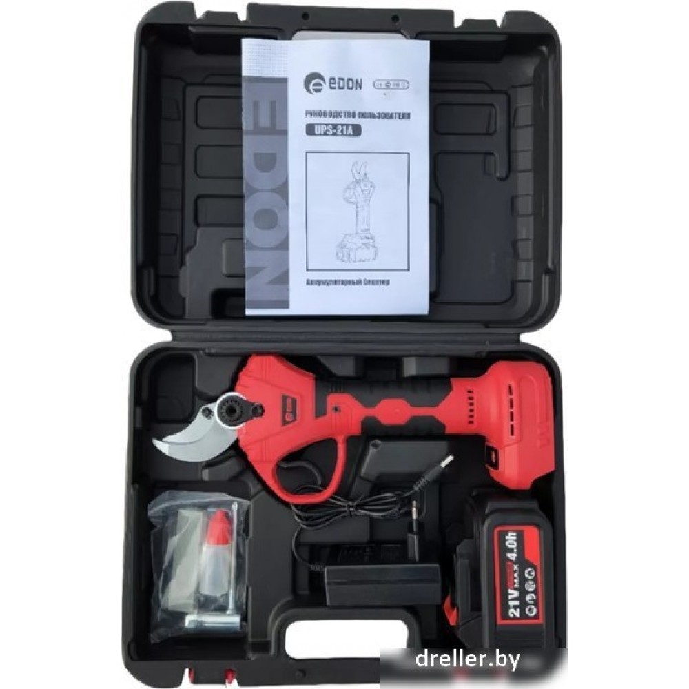 | Комплектация | 1. Секатор – 1 шт.; 2. Аккумулятор 4 Ач. - 1 шт.; 3. Зарядное устройство 1 А – 1 шт.; 4. Ключи – 3 шт.; 5. Брусок для заточки лезвия; 6. Масло для смазки лезвий и механизма – 1 шт.; 7. Инструкция – паспорт – 1 шт.; 8. Пластиковый кейс – 1 шт. |